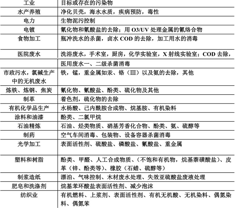 使用臭氧處理的廢水類(lèi)型 表1-1