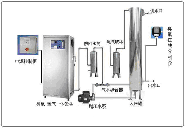 反應(yīng)裝置主要由臭氧、氧氣一體設(shè)備、反應(yīng)罐、剩余臭氧吸附器、增壓水泵、檢測儀器、控制柜等七部分組成(見圖1)。本實驗采我公司生產(chǎn)臭氧、氧氣一體設(shè)備聯(lián)用,其臭氧最大產(chǎn)量可達(dá)到5 g/h,并可調(diào)節(jié)濃度和氣體流量。反應(yīng)器高1 m,內(nèi)徑10 cm,臭氧從底部的底部增壓射流自吸進(jìn)入反應(yīng)器剩余臭氧用活性炭尾氣處理裝置吸收。