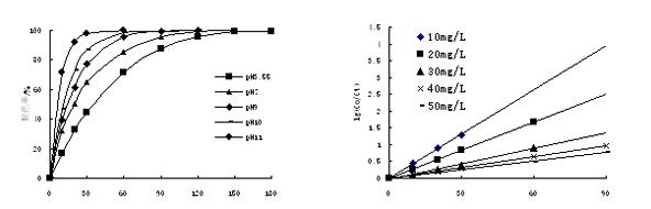 圖2 pH對降解效果的影響 圖3 相對于活性艷紅X-3B的反應(yīng)級數(shù)確定