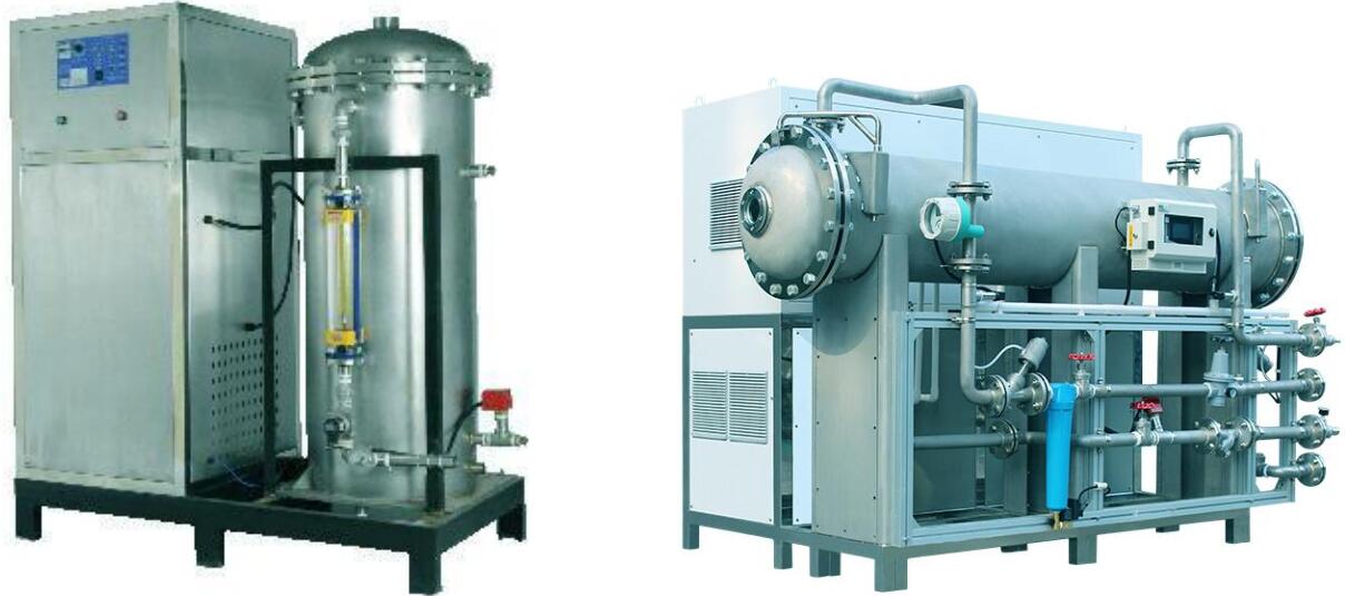 大中型臭氧發(fā)生器,主要由空氣壓縮機(jī)及凈化干燥系統(tǒng)、冷卻系統(tǒng)、臭氧放電室、電源控制系統(tǒng)、臭氧尾氣處理系統(tǒng)等五大部件組成。臭氧放電室采用當(dāng)今先進(jìn)非玻璃材質(zhì)鈦金脫羥石英管制作,該結(jié)構(gòu)使用極其穩(wěn)定、使用壽命長,具有放電效率高、遇回水不易損壞;加溫至燒紅狀態(tài),迅速放置冷卻水中(15--20℃)不裂不爆,完好無損。脫羥石英結(jié)構(gòu)的耐擊穿性能、耐冷熱突變性能高于精密陶瓷和搪瓷結(jié)構(gòu) 。